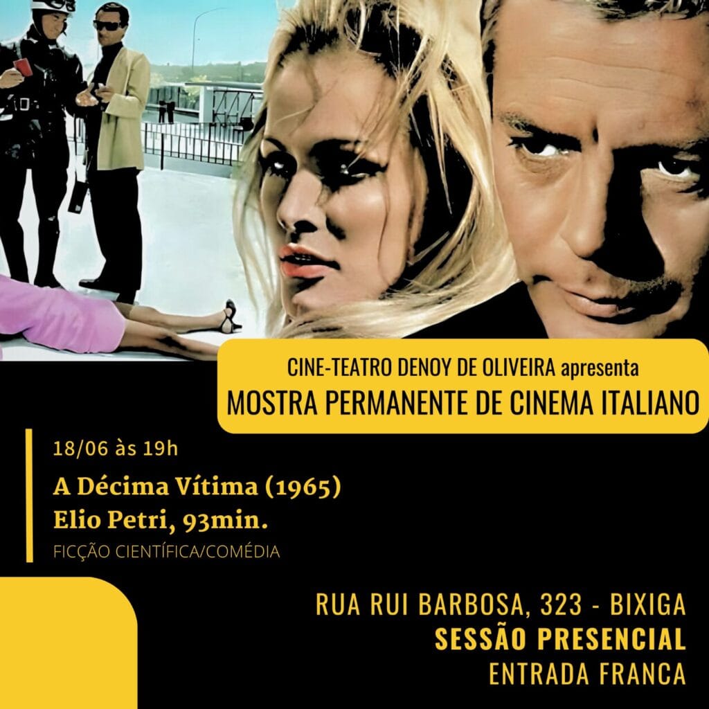 Na próxima segunda (17/06), exibiremos “A Décima Vítima”, sátira futurista de Elio Petri para a Mostra Permanente de Cinema Italiano!