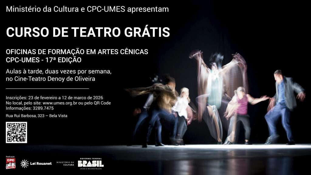 O CPC-UMES anuncia a abertura das inscrições para a 17ª Edição do seu Curso de Teatro. O projeto, que é totalmente gratuito, oferece oficinas de formação em artes cênicas voltadas para estudantes de escolas públicas.